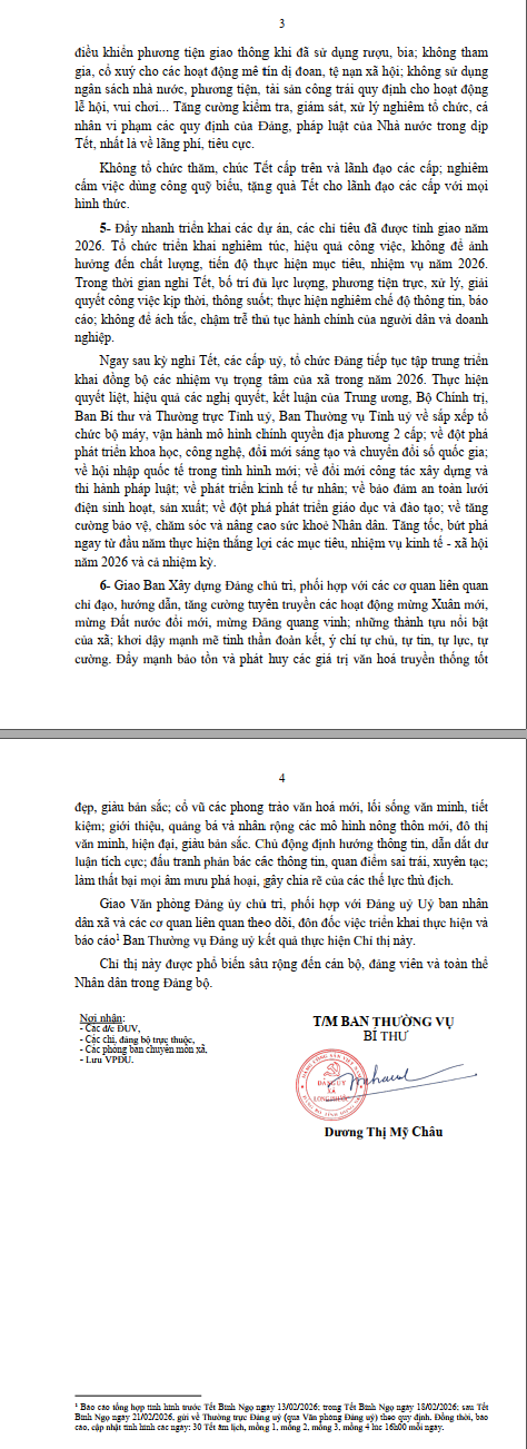 CHỈ THỊ CỦA BAN THƯỜNG VỤ ĐẢNG UỶ về việc tổ chức Tết Bính Ngọ năm 2026