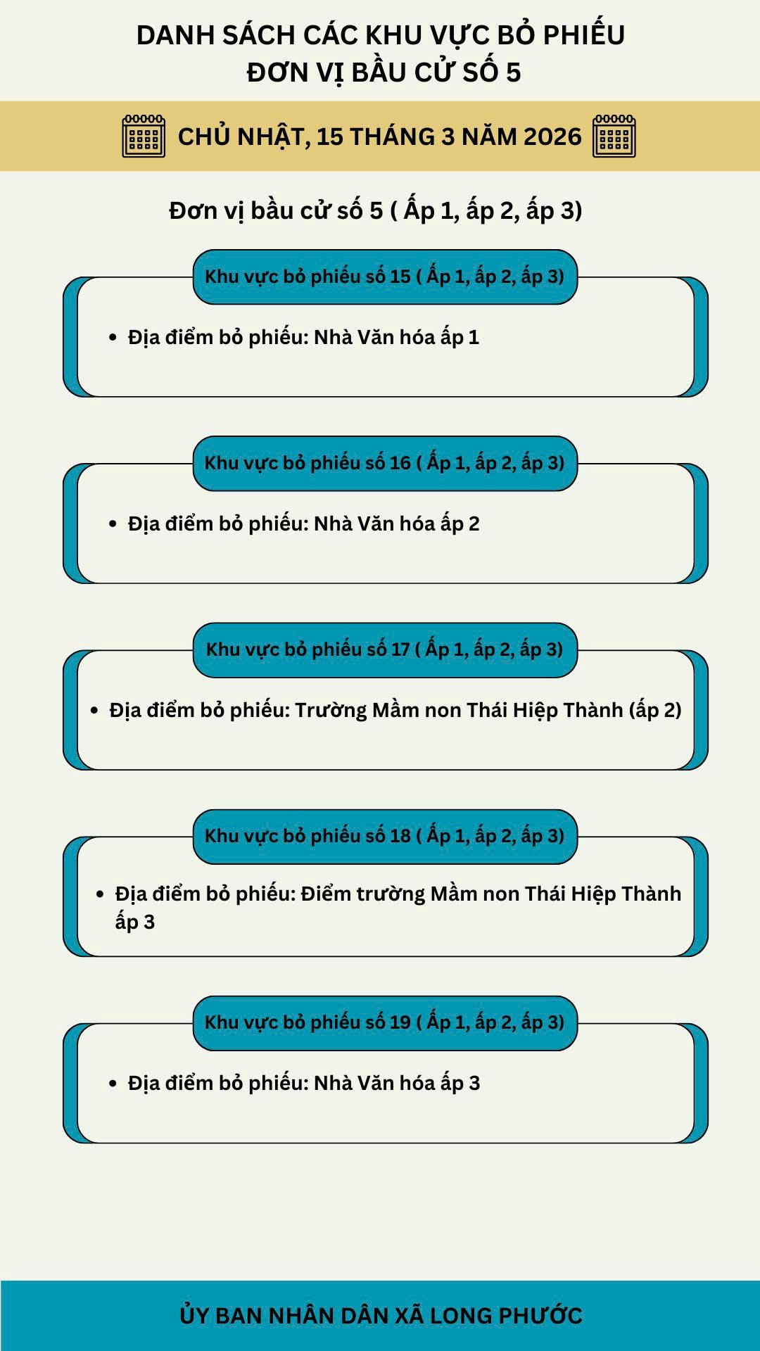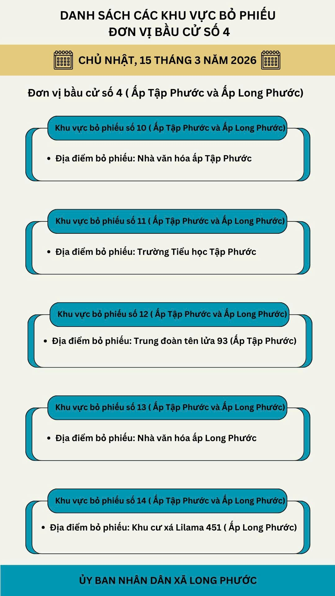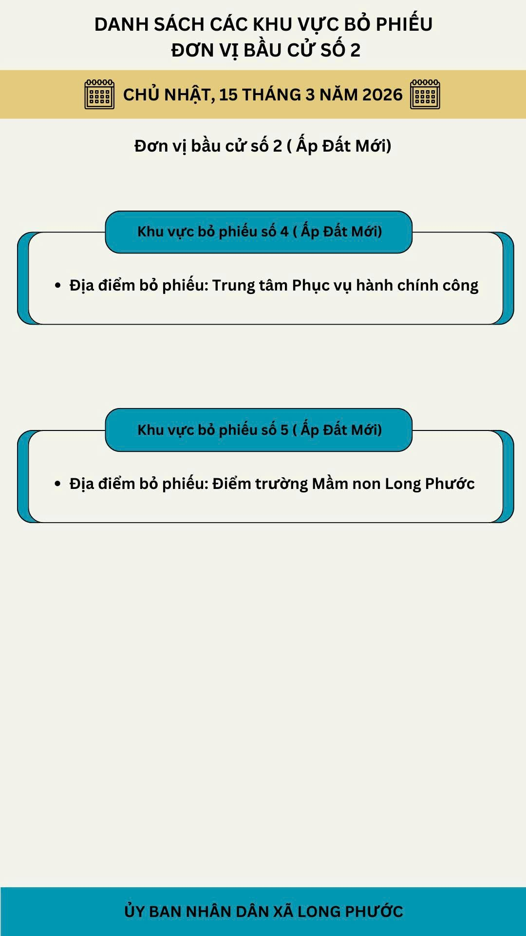 DANH SÁCH KHU VỰC BỎ PHIẾU BẦU CỬ ĐẠI BIỂU QUỐC HỘI KHOÁ XVI VÀ BẦU CỬ HỘI ĐỒNG NHÂN DÂN CÁC CẤP, NHIỆM KỲ 2026 - 2031 TRÊN ĐỊA BÀN XÃ LONG PHƯỚC