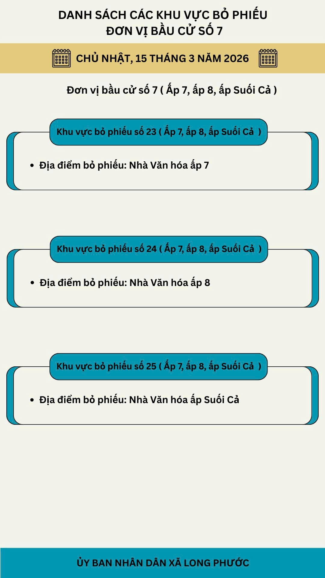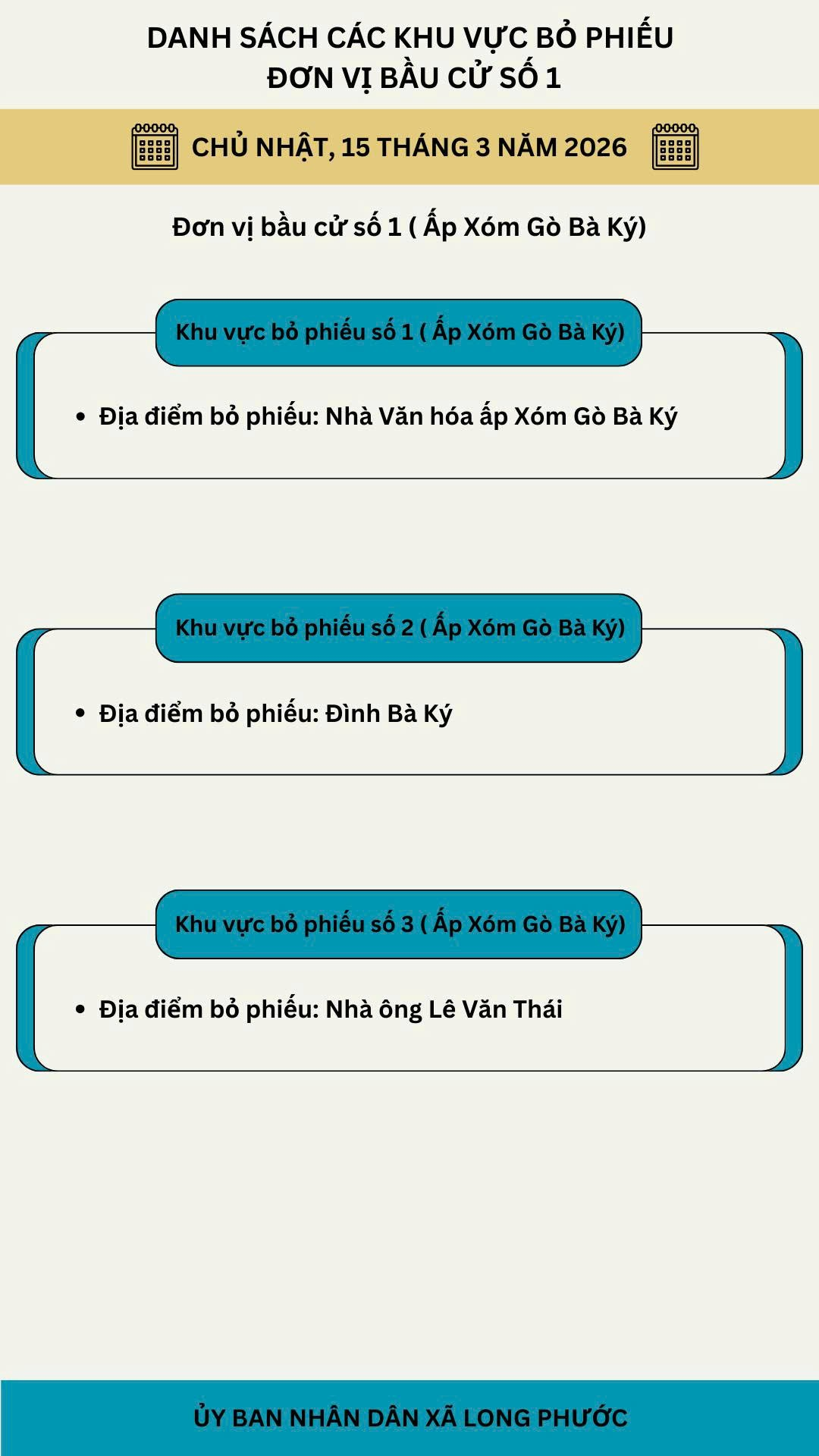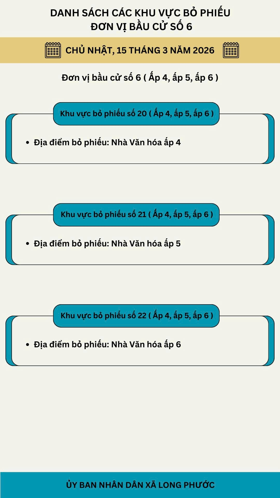 DANH SÁCH KHU VỰC BỎ PHIẾU BẦU CỬ ĐẠI BIỂU QUỐC HỘI KHOÁ XVI VÀ BẦU CỬ HỘI ĐỒNG NHÂN DÂN CÁC CẤP, NHIỆM KỲ 2026 - 2031 TRÊN ĐỊA BÀN XÃ LONG PHƯỚC