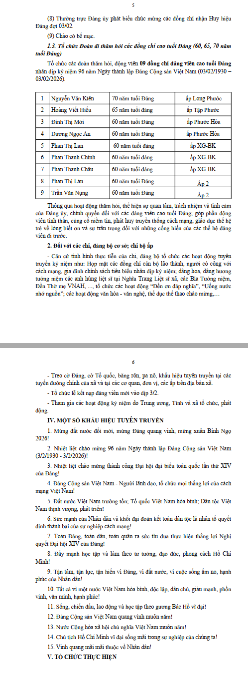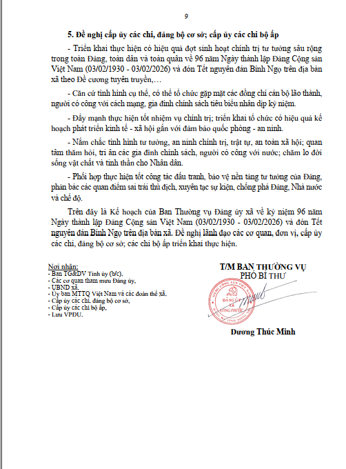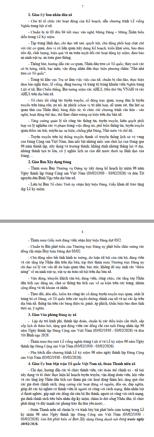kế hoạch kỷ niệm 96 năm Ngày thành lập Đảng Cộng sản Việt Nam (03/02/1930 - 03/02/2026) và đón Tết nguyên đán Bính Ngọ