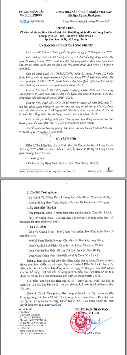 Quyết định về việc thành lập Ban cầu cử đại biểu Hội đồng nhân dân xã Long Phước nhiệm kỳ 2026-2031 tại đơn vị Bầu cử số 1 ấp Xóm Gò Bà Ký xã Long Phước
