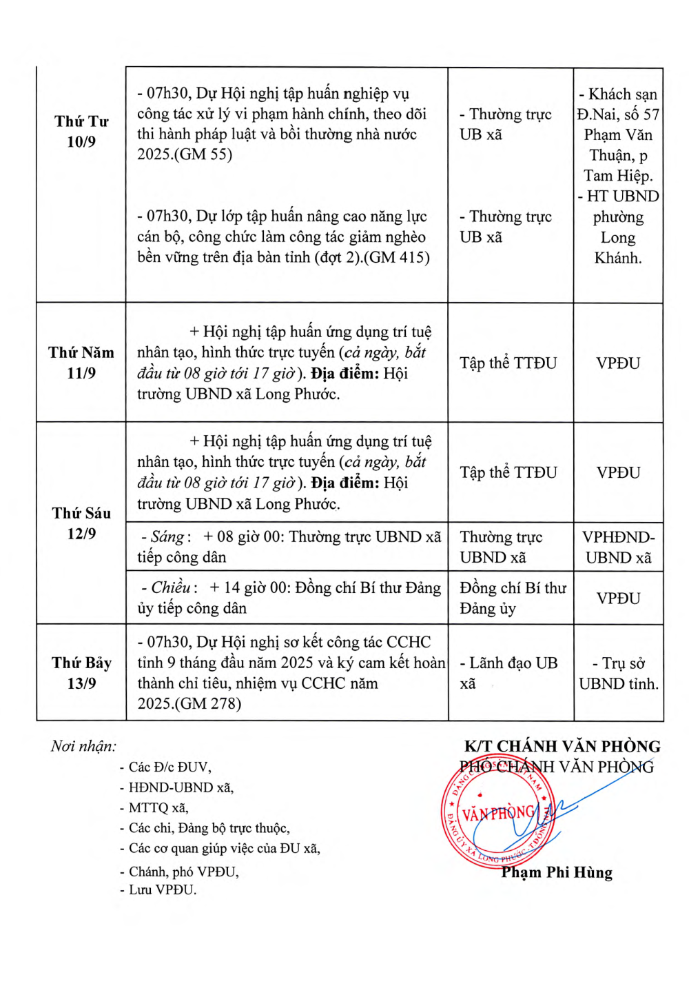 Thông báo chương trình làm việc tuần của thường trực Đảng ủy xã Long Phước từ ngày 08/9/2025 - 12/9/2025