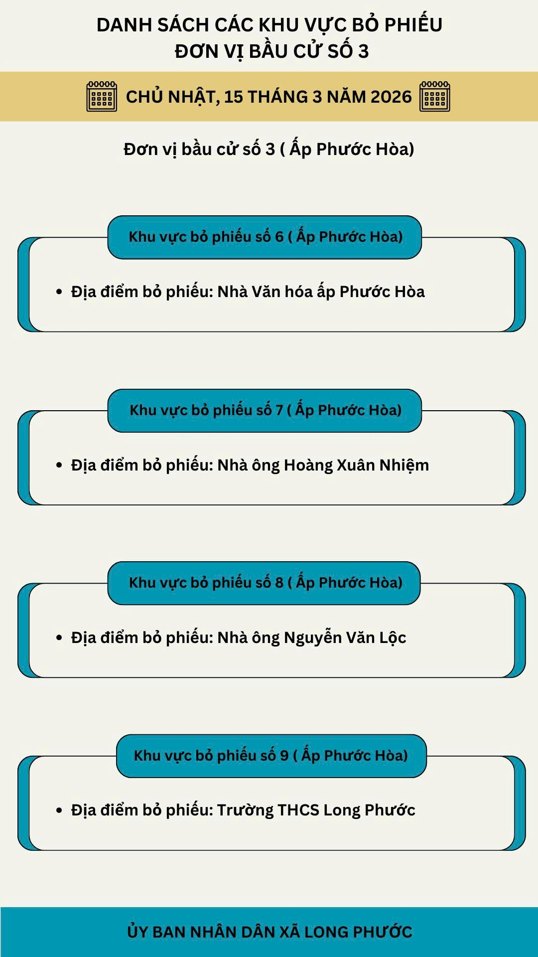 <meta property="og:title" content="DANH SÁCH KHU VỰC BỎ PHIẾU BẦU CỬ ĐẠI BIỂU QUỐC HỘI KHOÁ XVI VÀ BẦU CỬ HỘI ĐỒNG NHÂN DÂN CÁC CẤP, NHIỆM KỲ 2026 - 2031 TRÊN ĐỊA BÀN XÃ LONG PHƯỚC">