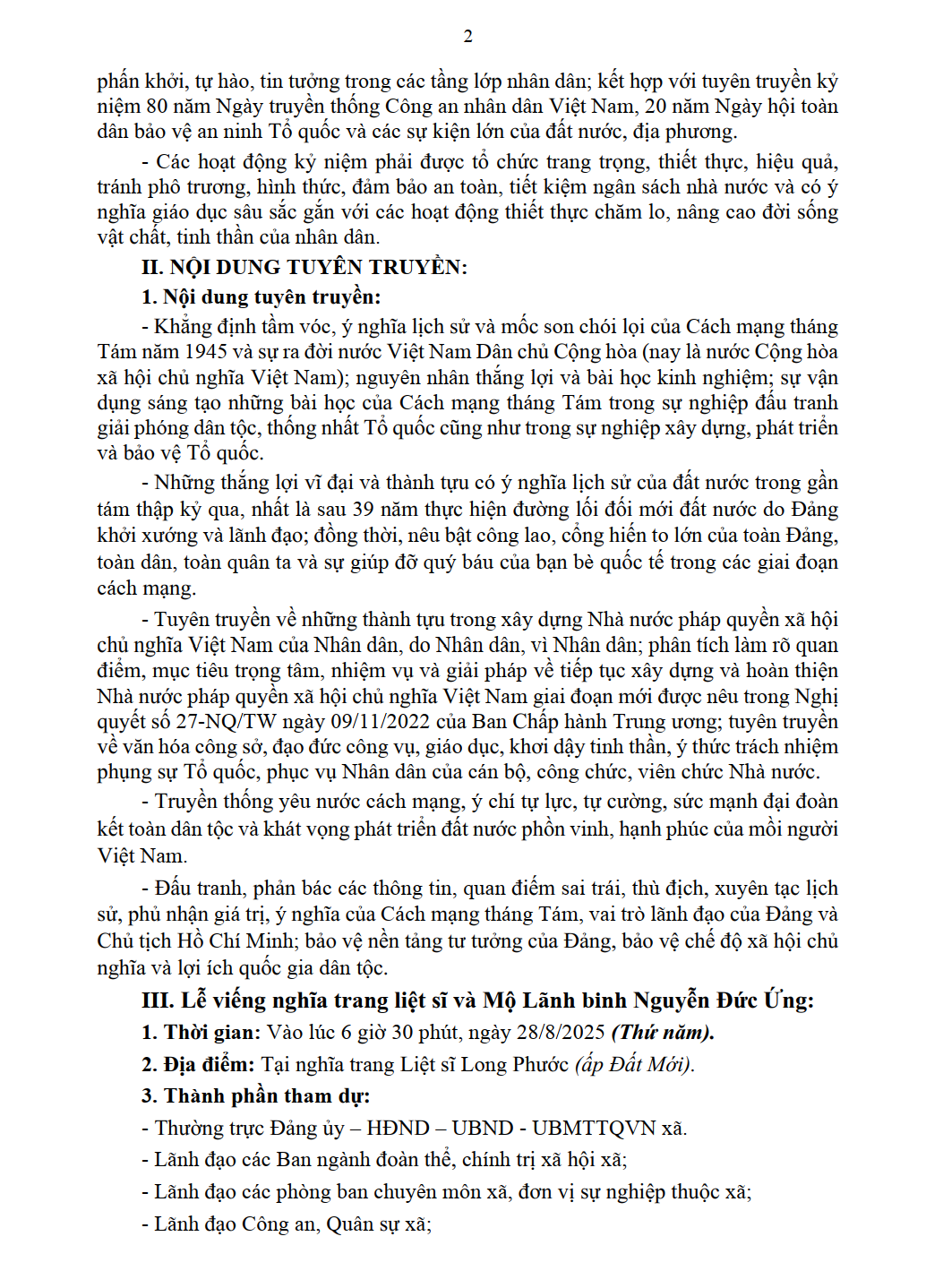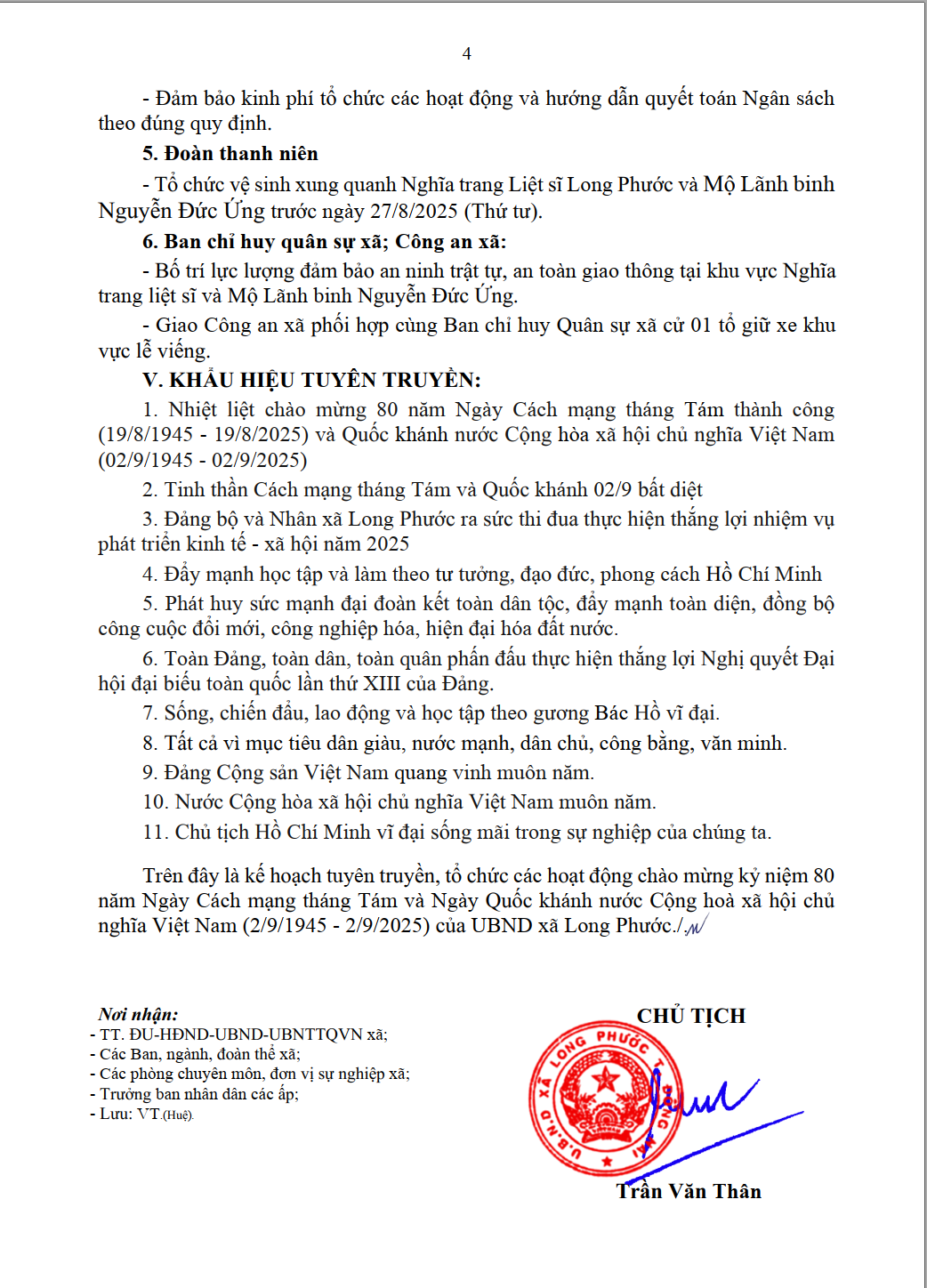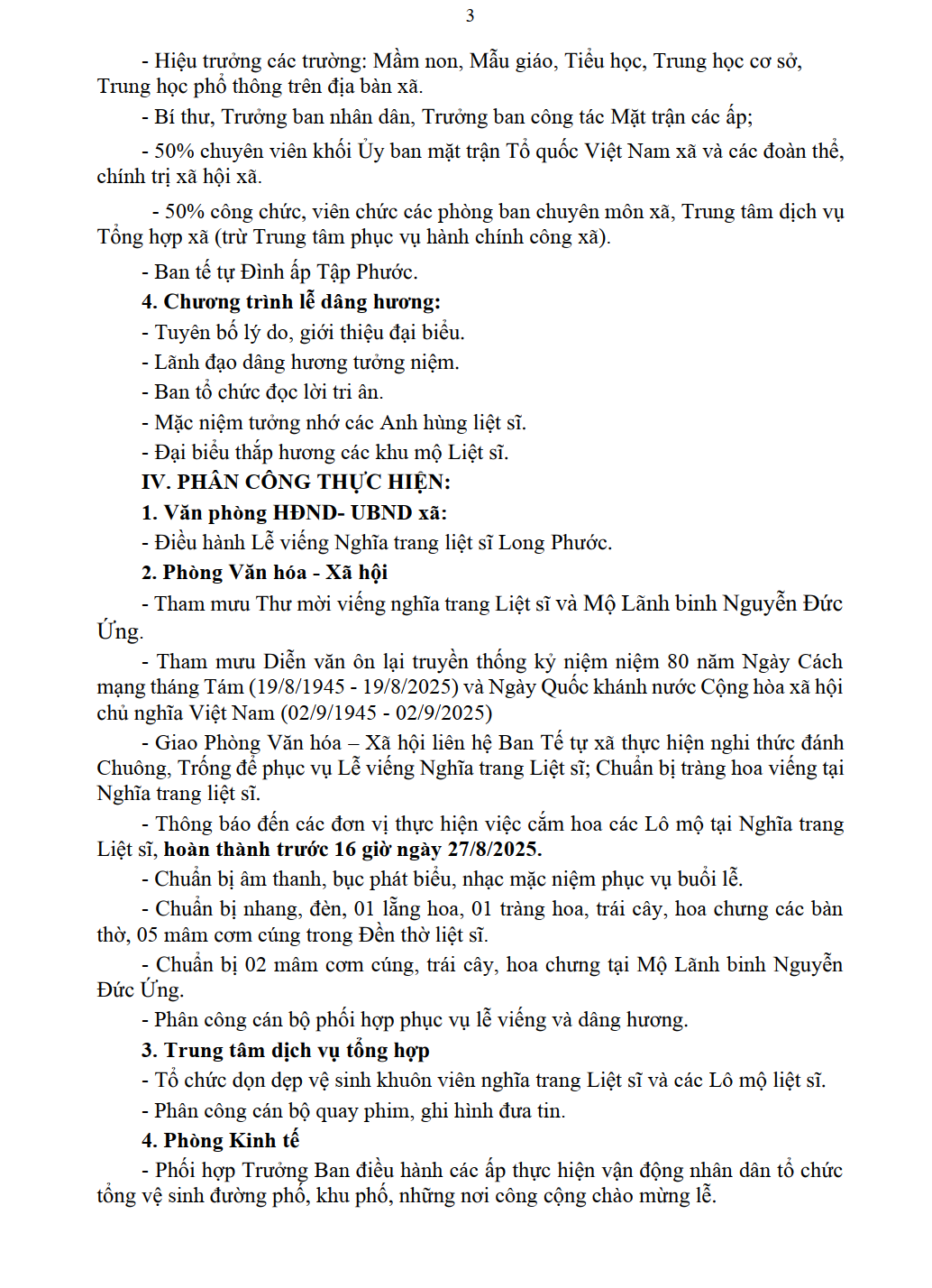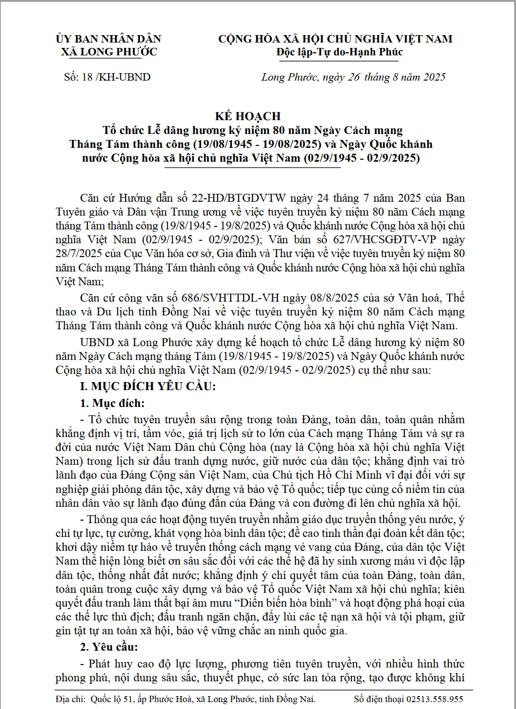 Kỷ niệm 80 năm Quốc khánh 2-9 UBND xã Long Phước ban hành kế hoạch tổ chức dâng hương kỷ niệm 80 năm Ngày Cách mạng tháng Tám (19/8/1945 - 19/8/2025) và Ngày Quốc khánh nước Cộng hòa xã hội chủ nghĩa Việt Nam (02/9/1945 - 02/9/2025)
