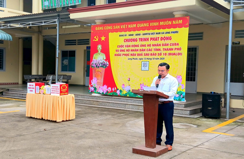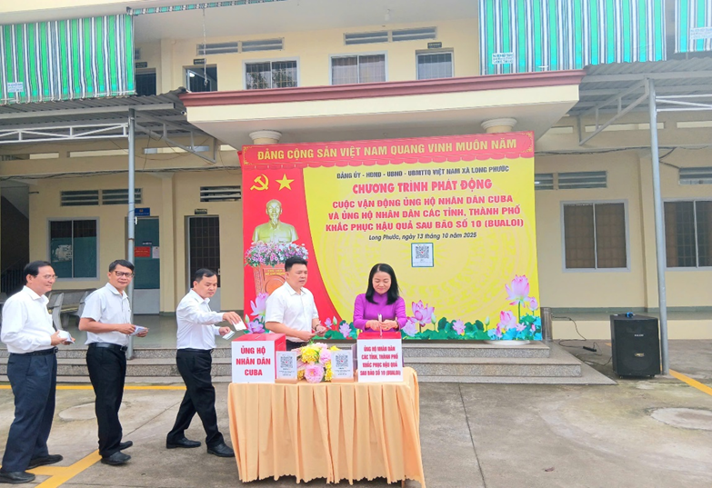 Trong sáng 13/10/2025, sau nghi thức Chào cờ thứ Hai đầu tuần, Đảng ủy-HĐND-UBND- UBMTTQVN xã Long Phước long trọng tổ chức Lễ phát động chương trình quyên góp, ủng hộ đầy ý nghĩa nhằm chia sẻ khó khăn với nhân dân Cuba anh em và đồng bào các tỉnh, thành phố phía bắc bị thiệt hại nặng nề do cơn bão số 10 (Bualoi) gây ra vào cuối tháng 9, đầu tháng 10 năm 2025.